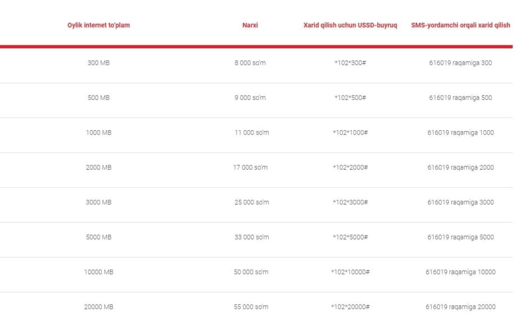 - Ойлик абонент тўлови: 20 минг сўм.
