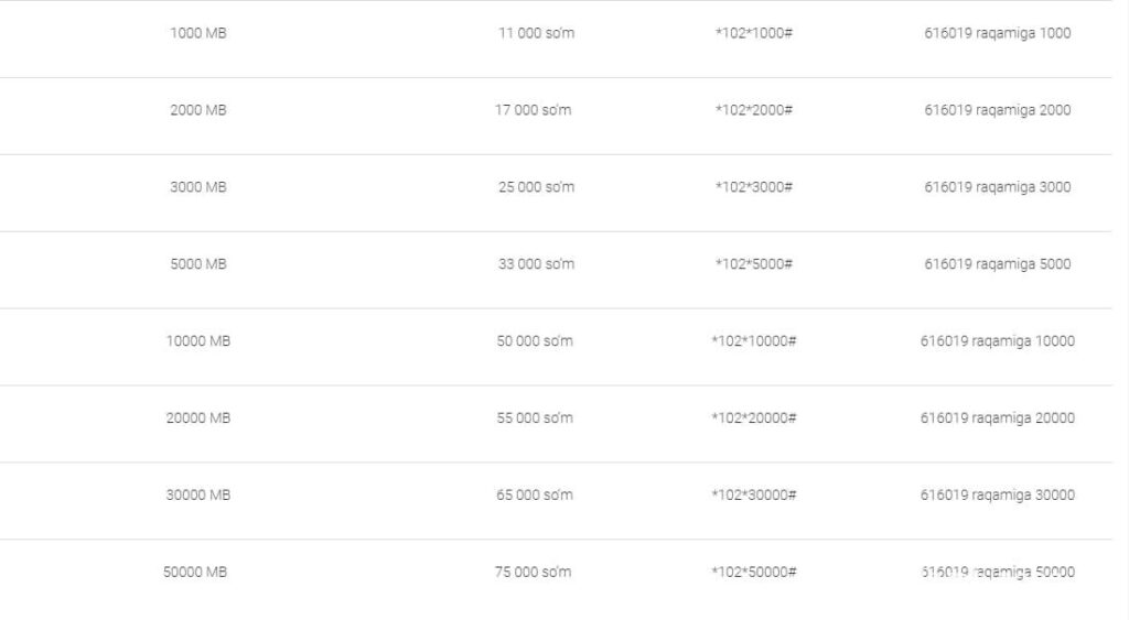 - Қўнғироқлар: Ўзбекистон бўйлаб чиқувчи қўнғироқларга 1 000 дақиқа;